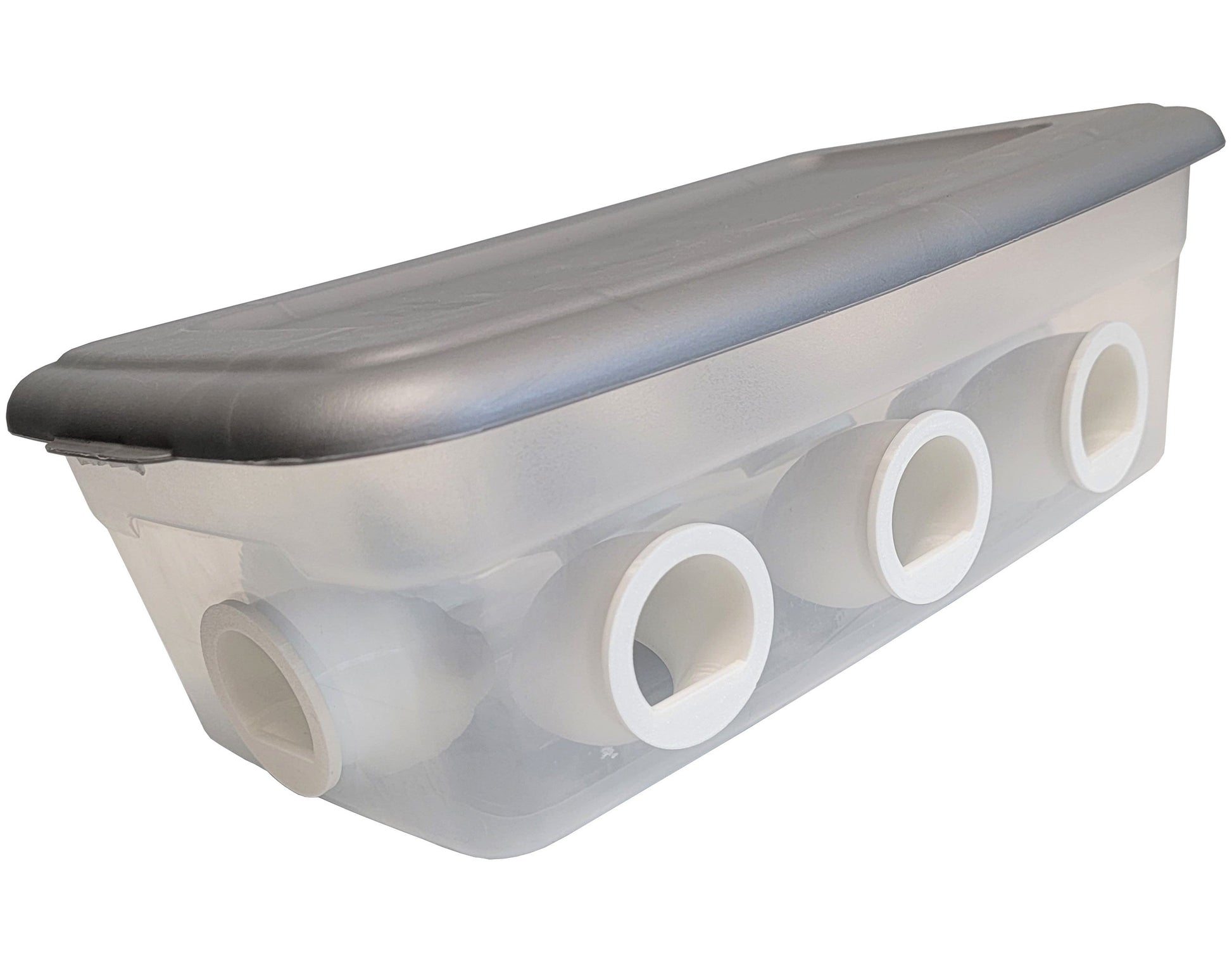 Rite Farm Products strong, washable poly Quail and baby chick port style feeders. Feed saver ports allow you to make and design your own Quail and baby chicken feeders from upcycling your old buckets and containers. Ports are 1 1/2 inches inside and are 1 3/4 inches outside. You simply drill a 1 3/4-inch hole in your container and insert the port feeder. Attaching with glue is optional. No bins or containers are included, and this is for feeder ports only. Bin with ports pictured is for reference only. Made from high-density, impact-resistant PLA plastic that will not rust, rot, or corrode and is environmentally friendly and made from corn. Easy to keep clean plastic surface. Outside measurements are 2 inches wide overall including lip and you drill a 1.75-inch hole to insert into your bucket, pail, bin, or container. Made in the USA in Saltillo Texas.